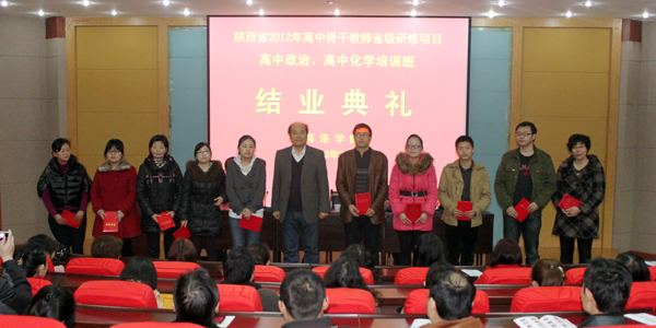 3月12日上午,我院承辦的陜西省2012年高中骨干教師省級(jí)研修項(xiàng)目高中政治、高中化學(xué)培訓(xùn)班舉辦了結(jié)業(yè)典禮。院長、學(xué)院“國培計(jì)劃”和省級(jí)培訓(xùn)項(xiàng)目領(lǐng)導(dǎo)小組組長張景書,副院長、學(xué)院“國培計(jì)劃”和省級(jí)培訓(xùn)項(xiàng)目領(lǐng)導(dǎo)小組副組長劉建林親臨結(jié)業(yè)典禮現(xiàn)場,與學(xué)員們合影留念,并為學(xué)員們頒發(fā)證書。