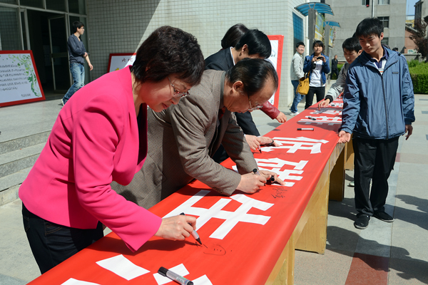 曾佳偉代表全校學(xué)生做了表態(tài)發(fā)言。出席儀式的領(lǐng)導(dǎo)和學(xué)生代表們?cè)凇肮?jié)能減排,低碳生活”宣傳橫幅上簽名。