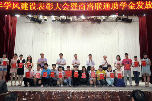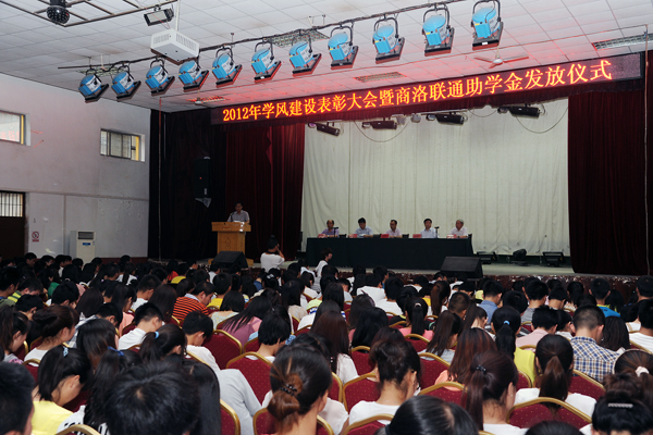為了進一步推進學風建設和學生自主創(chuàng)業(yè)工作,營造良好的育人氛圍,5月22日下午,我校隆重召開學風建設表彰大會,對2012年度國家獎學金、國家勵志獎學金獲獎學生進行表彰,對田亦柏等5名自主創(chuàng)業(yè)大學生進行獎勵,對2012年學風建設先進集體進行表彰,同時為程時妍等20名2013年商洛聯(lián)通助學金受助學生發(fā)放了助學金。校黨委書記張繼良、院長張景書,商洛聯(lián)通公司黨委書記溫長山,校黨委副書記左曉民、副院長劉建林出席大會。左曉民在會上宣讀了學校表彰決定,劉建林主持大會。