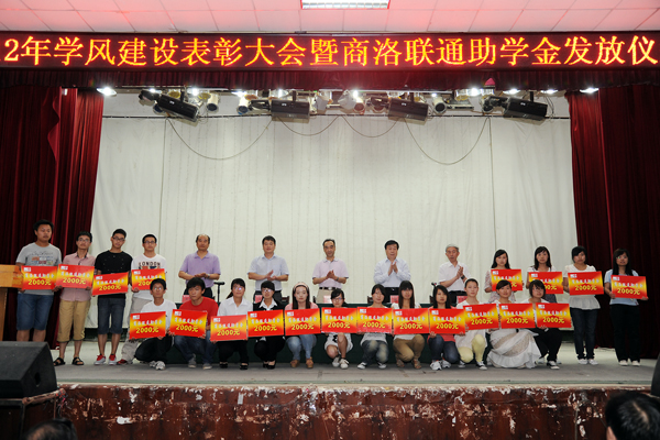 2012年11月29日,我校與商洛聯(lián)通公司簽署了《戰(zhàn)略合作協(xié)議》。今年商洛聯(lián)通公司在我校設立助學金,資助我校家庭經濟困難學生20名,每人資助2000元。