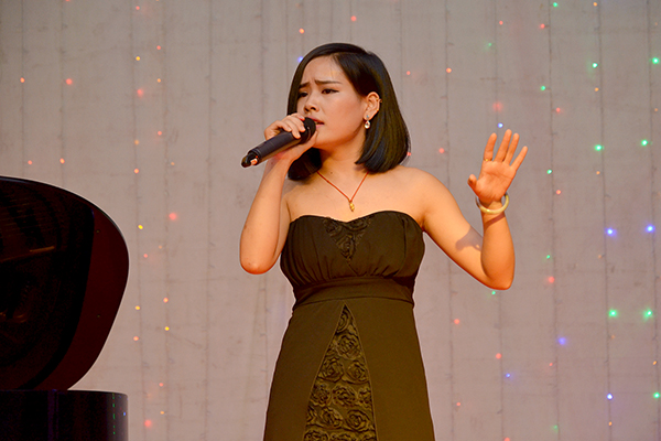 音樂學(xué)專業(yè)優(yōu)秀畢業(yè)生陳穎、竇貝貝、吳丹、強(qiáng)薇、郭敏、楊柳、褚瑤為大家?guī)砹司实谋硌??!段矣H愛的爸爸》旋律優(yōu)美,演唱深情動人,描寫了少女勞萊達(dá)為追求愛情向爸爸懇求的場景;《讓我這樣看著你的樣子》生動形象地講述了巴丹公主對花木蘭這位替父從軍的假小子投入愛慕之情的故事;《揚(yáng)鞭催馬運(yùn)糧忙》熱情明快,富有強(qiáng)烈的藝術(shù)感染力;二胡表演《奔馳在千里草原》描寫了牧民在草原上奔馳的情景,抒發(fā)了對未來幸福生活的向往;歌曲《我要我們在一起》宣唱著2010級畢業(yè)生對自由對未來無限向往的心聲。