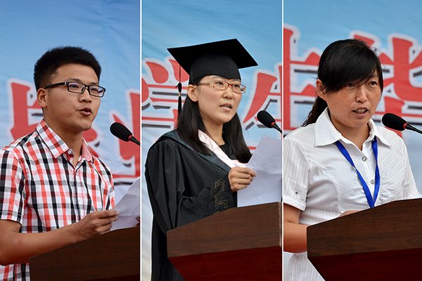 畢業(yè)生代表、經(jīng)濟(jì)與管理學(xué)院會(huì)計(jì)學(xué)專(zhuān)業(yè)2010級(jí)李真回憶了在校的四年光陰,對(duì)學(xué)校給自己帶來(lái)的種種收獲與感動(dòng)表示真誠(chéng)的感謝。生物醫(yī)藥與食品工程學(xué)院2011級(jí)學(xué)生劉淵代表在校生對(duì)畢業(yè)生送上了美好的祝愿,并代表全體在校生表達(dá)了勤勉學(xué)習(xí)的決心。