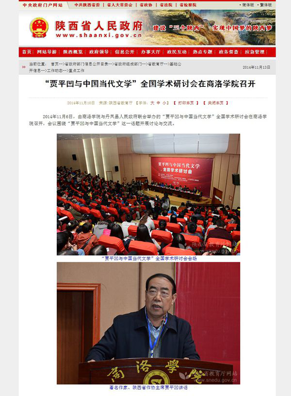 陜西省人民政府網(wǎng)站:《“賈平凹與中國(guó)當(dāng)代文學(xué)”全國(guó)學(xué)術(shù)研討會(huì)在商洛學(xué)院召開》 陜西省教育廳:《“賈平凹與中國(guó)當(dāng)代文學(xué)”全國(guó)學(xué)術(shù)研討會(huì)在商洛學(xué)院召開》