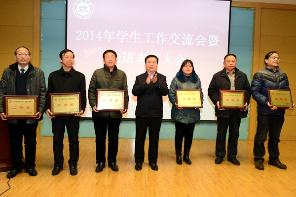 大會對生物醫(yī)藥工程學(xué)院等6個2014年學(xué)生工作先進集體、楊增強等8名學(xué)生管理先進個人、王曉等15名優(yōu)秀班主任、葉春等8名優(yōu)秀輔導(dǎo)員,以及2014年學(xué)生工作研究優(yōu)秀論文、優(yōu)秀學(xué)生工作日志進行了表彰。張景書、彭虎軍為獲獎集體和個人代表頒發(fā)了獎牌、證書。學(xué)生處處長石啟英宣讀了表彰決定。