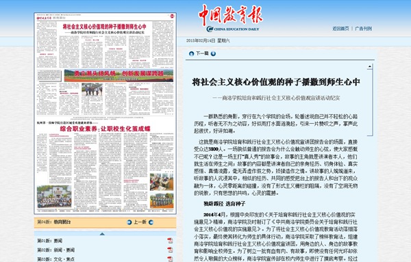 2月14日,《中國教育報》第4版以《將社會主義核心價值觀的種子播撒到師生心中》為題,對我校培育和踐行社會主義核心價值觀宣講活動進(jìn)行了報道。該文一經(jīng)刊發(fā),人民網(wǎng)、新華網(wǎng)、中國網(wǎng)、中國日報網(wǎng)、環(huán)球網(wǎng)、中國青年網(wǎng)、網(wǎng)易、騰訊網(wǎng)等全國各大媒體紛紛轉(zhuǎn)載,在社會上引起了強(qiáng)烈反響。