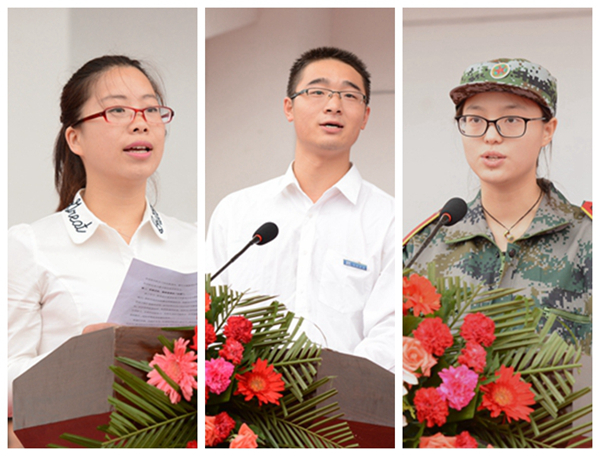 化學(xué)工程與現(xiàn)代材料學(xué)院教師曹寶月博士,2013級(jí)經(jīng)濟(jì)與管理學(xué)院學(xué)生魚慶彬,2015級(jí)生物醫(yī)藥與食品工程學(xué)院學(xué)生田夢(mèng)婷分別代表學(xué)校教師、在校生和新生作了發(fā)言。