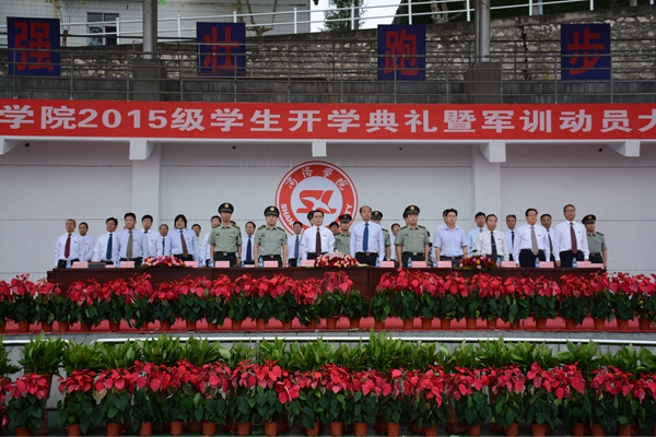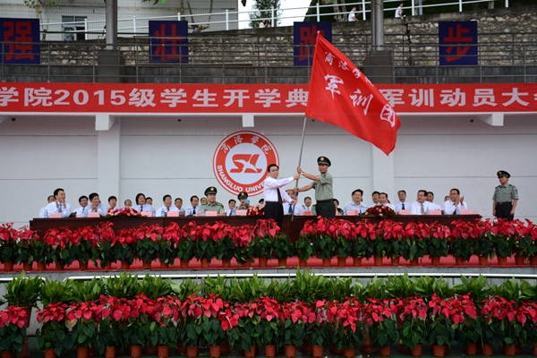 驕驕學(xué)子,今登堂明入室,星夜兼程圓好夢(mèng);巍巍黌門,才送往又迎來,躬耕不輟育國魂。9月8日,我校隆重舉行2015級(jí)學(xué)生開學(xué)典禮暨軍訓(xùn)動(dòng)員大會(huì)。校領(lǐng)導(dǎo)張景書、劉建林、王思懷、魏書堂、彭虎軍、范新會(huì)、劉寶盈,解放軍西安政治學(xué)院黨委常委、院務(wù)部部長邱仕偉大校,解放軍西安政治學(xué)院政治部副主任張新軍大校,解放軍西安政治學(xué)院軍事系教授、學(xué)生軍訓(xùn)團(tuán)團(tuán)長劉京生大校,商洛市人民政府副秘書長宋奇志出席了大會(huì)。校黨委書記張景書向承訓(xùn)教官授2015級(jí)學(xué)生軍訓(xùn)團(tuán)團(tuán)旗,校黨委副書記、校長劉建林作了重要講話。大會(huì)由校黨委副書記彭虎軍主持。各院部黨政負(fù)責(zé)人、各職能部門負(fù)責(zé)人與2015級(jí)新生參加了大會(huì)。