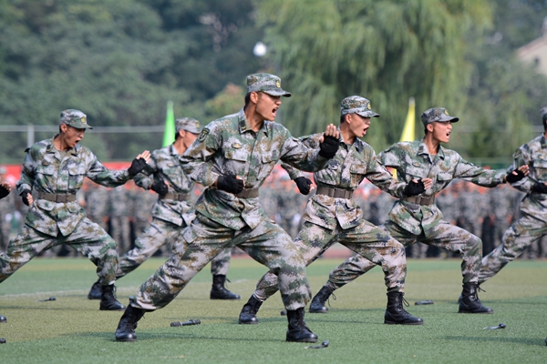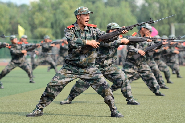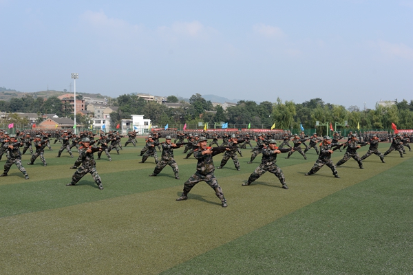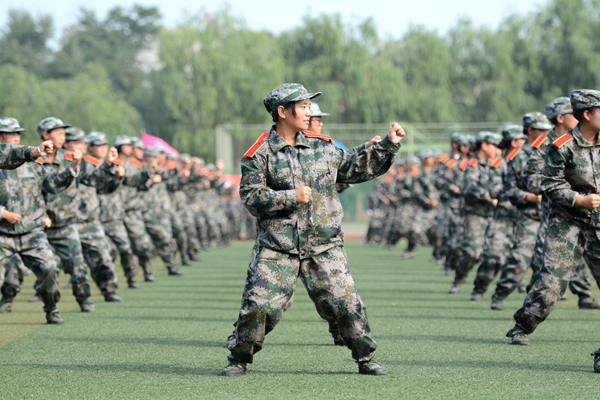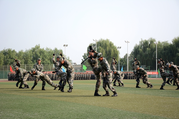 軍訓(xùn)團(tuán)各連組成持槍方陣、刺刀方陣、衛(wèi)生兵方陣等25個受閱方陣進(jìn)行了分列式表演。同學(xué)們口號嘹亮、動作整齊、步伐穩(wěn)健、英姿颯爽,以嚴(yán)整的軍容軍姿依次通過主席臺,充分展現(xiàn)了我校學(xué)生的精神風(fēng)貌。分列式結(jié)束后,我校學(xué)生進(jìn)行了刺殺操、花樣隊列和軍體拳匯報表演。男子刺殺操動作整齊利落、殺氣騰騰,展示了壓倒一切敵人的英雄氣概。伴隨著《強(qiáng)軍戰(zhàn)歌》的激揚(yáng)旋律,300名女兵進(jìn)行了花式隊列表演,她們排出了巨大的“70”“1945 2015”字樣,紀(jì)念抗日戰(zhàn)爭暨世界反法西斯戰(zhàn)爭勝利70周年,表達(dá)我校學(xué)生“銘記歷史、緬懷先烈、珍愛和平、開創(chuàng)未來”的堅定信念;在校歌《正道直行做棟梁》的旋律中,同學(xué)們又?jǐn)[出了我校?;盏牧Ⅲw造型,引來現(xiàn)場熱烈的掌聲。由720人表演的軍體拳動作精煉、節(jié)奏分明、套路連貫、氣勢磅礴、喊殺聲震天,贏得了現(xiàn)場陣陣熱烈的掌聲。軍訓(xùn)教官也進(jìn)行了捕俘拳表演,將現(xiàn)場氣氛推向了高潮。