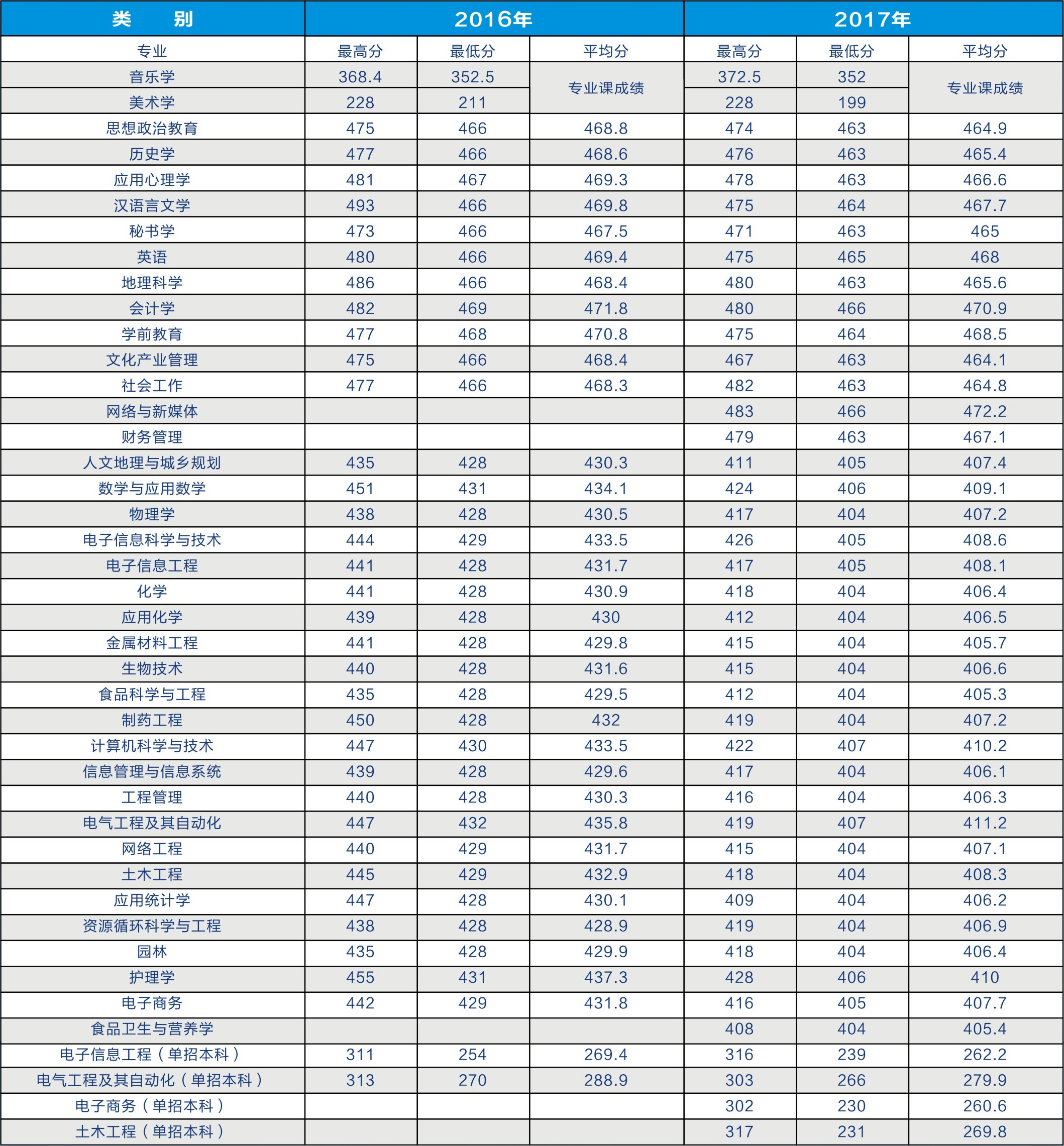 2016-2017年在陜各專業(yè)錄取分?jǐn)?shù)統(tǒng)計(jì)表