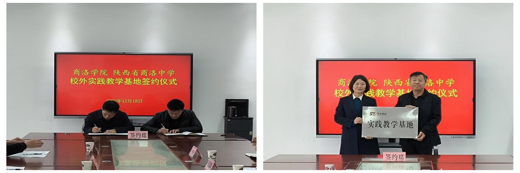 當天上午,“商洛學院與陜西省商洛中學校外實踐教學基地”簽約暨授牌儀式在商洛中學舉行。商洛中學教務處主任劉丹軍與商洛學院人文學院院長張文諾共同簽署合作協(xié)議。商洛學院教務處處長王怡與商洛中學副校長武高鵬為基地揭牌,并向商洛中學贈送教育教學類書籍。