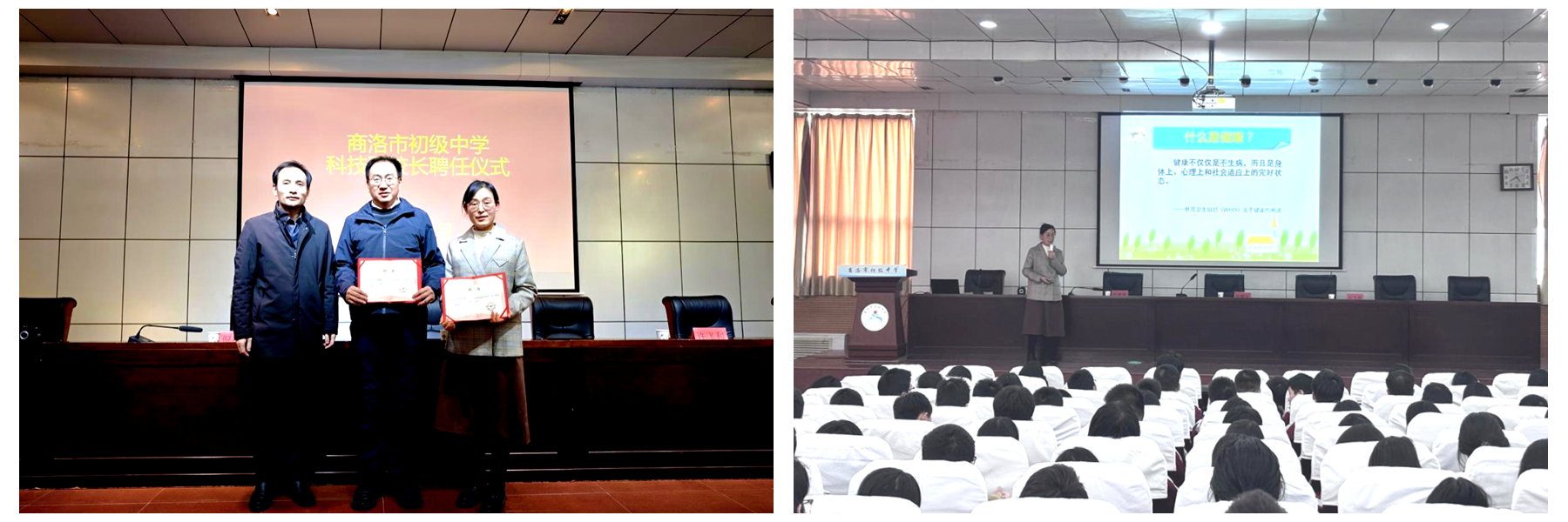 11月19日,應(yīng)商洛市初級(jí)中學(xué)邀請(qǐng),健康管理學(xué)院院長郭耀東、公共衛(wèi)生系教師許飛利前往該校開展“科學(xué)管理體重,健康快樂成長”主題教育培訓(xùn)。商洛市初級(jí)中學(xué)校長倪德博出席活動(dòng),并在現(xiàn)場聘任郭耀東為學(xué)校科技副校長、許飛利為健康教育指導(dǎo)專家。
