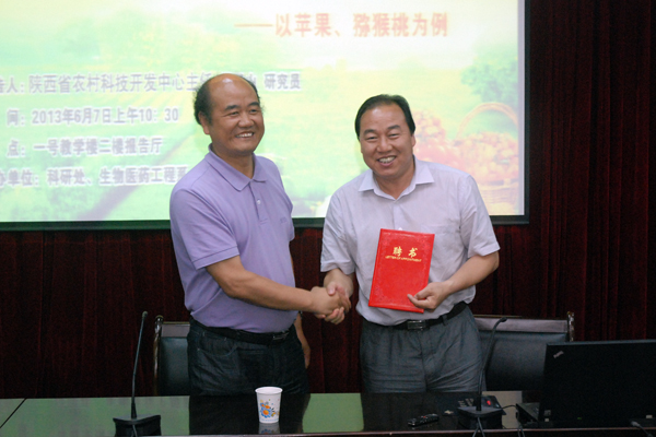 6月7日上午,我校舉行兼職教授受聘儀式,陜西省科技廳農(nóng)村科技開發(fā)中心主任雷玉山研究員受聘為我校兼職教授,副院長劉建林為雷玉山頒發(fā)了聘書。雷玉山還為我校生物醫(yī)藥工程系師生作了題為《農(nóng)產(chǎn)品質(zhì)量安全問題與對策》的專題報告,并向我校捐贈了多部個人著作