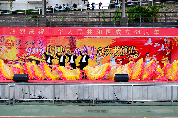 為慶祝新中國第64個生日,迎接2013級新生,9月26日下午,我校舉辦了“2013慶國慶·迎新生”大型文藝演出。西安音樂學(xué)院學(xué)院70余名師生應(yīng)邀友情出演,和我校師生、商洛劇團(tuán)青年歌手李淼輪番登臺獻(xiàn)藝,表演了民樂合奏、歌伴舞、獨(dú)唱、舞蹈、健身秧歌等19個節(jié)目。熱烈祥和的氣氛、清新高雅的藝術(shù)為校園帶來了節(jié)日的歡樂和文化的盛宴